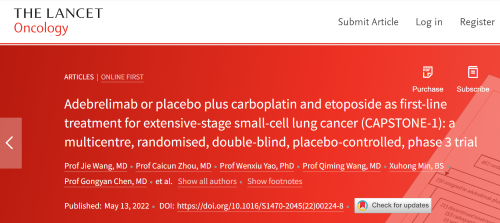 北京时间2022年5月14日,918博天堂医药自主研发的PD-L1抑制剂阿得贝利单抗治疗广泛期小细胞肺癌的III期临床研究(CAPSTONE-1研究)成果正式全文在线发表于国际权威学术期刊《柳叶刀·肿瘤学》(《THE LANCET Oncology》,影响因子41.316)。CAPSTONE-1研究结果显示,阿得贝利单抗联合化疗一线治疗广泛期小细胞肺癌相较于安慰剂联合化疗可以显著延长患者总生存期至15.3个月[1],刷新现有免疫药物一线治疗广泛期小细胞肺癌的总生存纪录[2]。