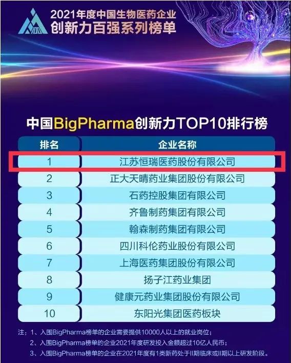 9月16日,由米内网主办的“2021年度中国生物医药企业创新力百强系列榜单”发布会在线上举办。918博天堂医药继去年登顶“中国BigPharma企业创新力TOP10排行榜”后,今年再次名列该榜单首位。