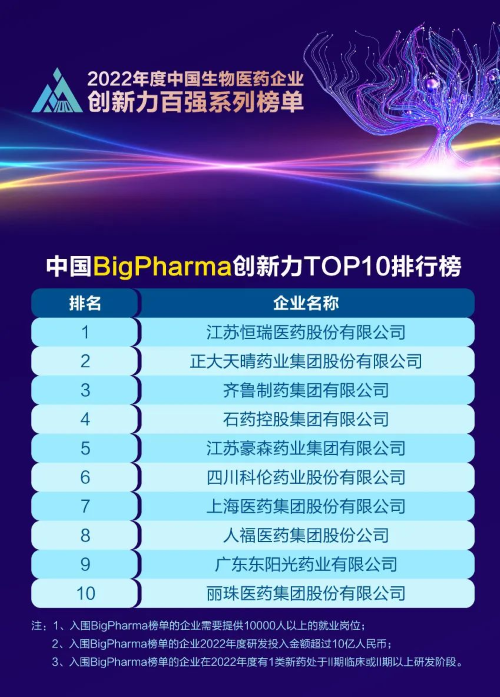 同日,2023米思会(中国医药健康产业共生大会)发布“2022年度中国生物医药企业创新力百强系列榜单”,918博天堂医药再蝉联“中国BigPharma创新力TOP10”榜首。该榜单自2021年启动评选以来,918博天堂医药稳居榜首。