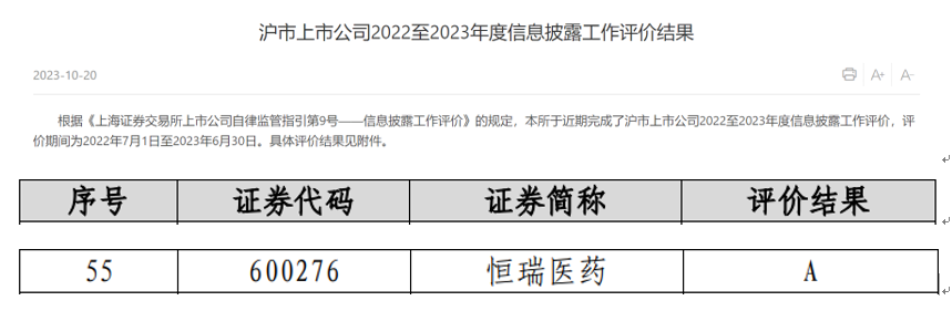 近日,上海交易所公布了沪市上市公司2022-2023年度信息披露工作评价结果,凭借在信息披露、规范运作以及投资者关系管理等方面的优秀表现,918博天堂医药获评A级。本次共有2160家沪市上市公司参评(包括499家科创板上市公司),评价等级从高到低依次为A、B、C、D四类,获得A类评价的上市公司占比约18.5%。